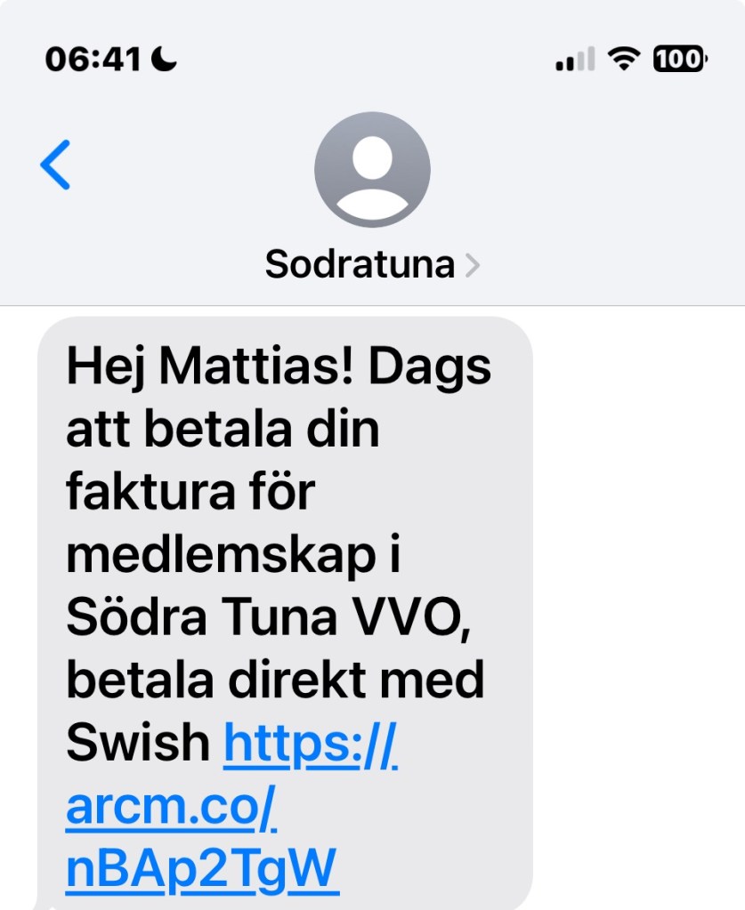 - Nytt för i år är att vi inför möjlighet att betala fakturor från oss med Swish som komplement till Bankgiro. Det kommer skickas både ett SMS med betalningslänk (se bild nedan) och e-post, alternativt ett brev till de som vi saknar uppgifter till.