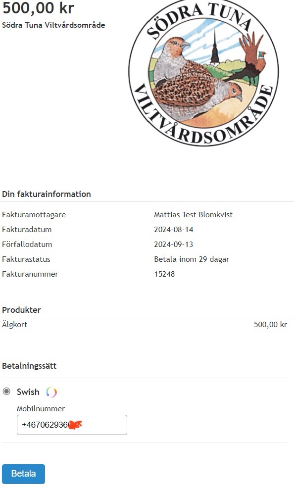 När ni klickar på länken i sms:et kommer ni till en sida för betalning som set ut så här:
